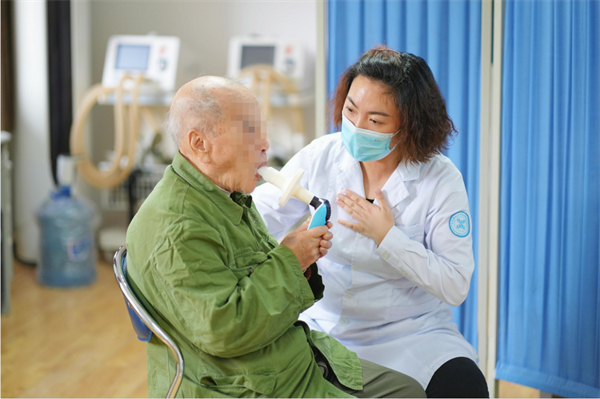 伍秋含指导患者进行呼吸功能训练。