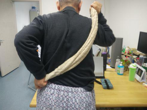 担心洗不到背部以及左侧,治疗师做示范后给他毛巾完成搓洗背部,并叮嘱他在家采取坐位完成洗澡。