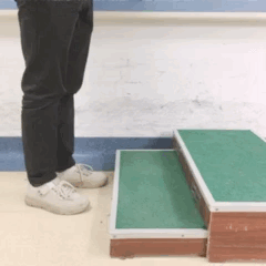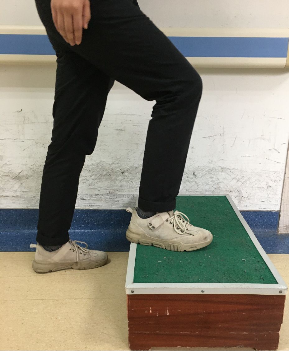 患者将健足放在前面的台阶上,注意缓慢小心,不要重重地落下去。偏瘫腿保持平衡,患者可将健足放在台阶上轻轻打拍。若想增加训练难度,可增加台阶高度,10次/组。