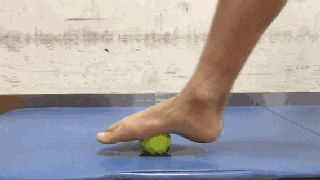 1、在利用自身重力和疼痛可耐受情况下,用网球或筋膜球从足跟到足底依次放松足底筋膜