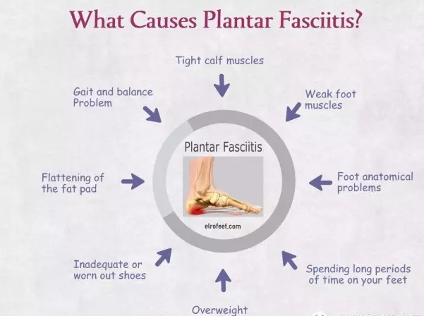 足底筋膜位于跟骨与跖骨间,为一强壮、具有相当厚度的扇状弹力结缔组织,起自跟骨结节向前成扇形分布,止于五个跖骨头及近节趾骨基底的纤维腱性组织。其作用是维持足的纵弓、缓冲震荡的作用。当我们的足底因为长时间的跑步、登山、过度的走路、逛街等因素过度拉伸,而导致肌腱或者筋膜发生无菌性炎症、进而出现足跟部疼痛不适,第二天起床刚落地时疼痛明显,并且用手按压足底靠近足跟的部位疼痛最为明显,这就引起了典型的足底筋膜炎。