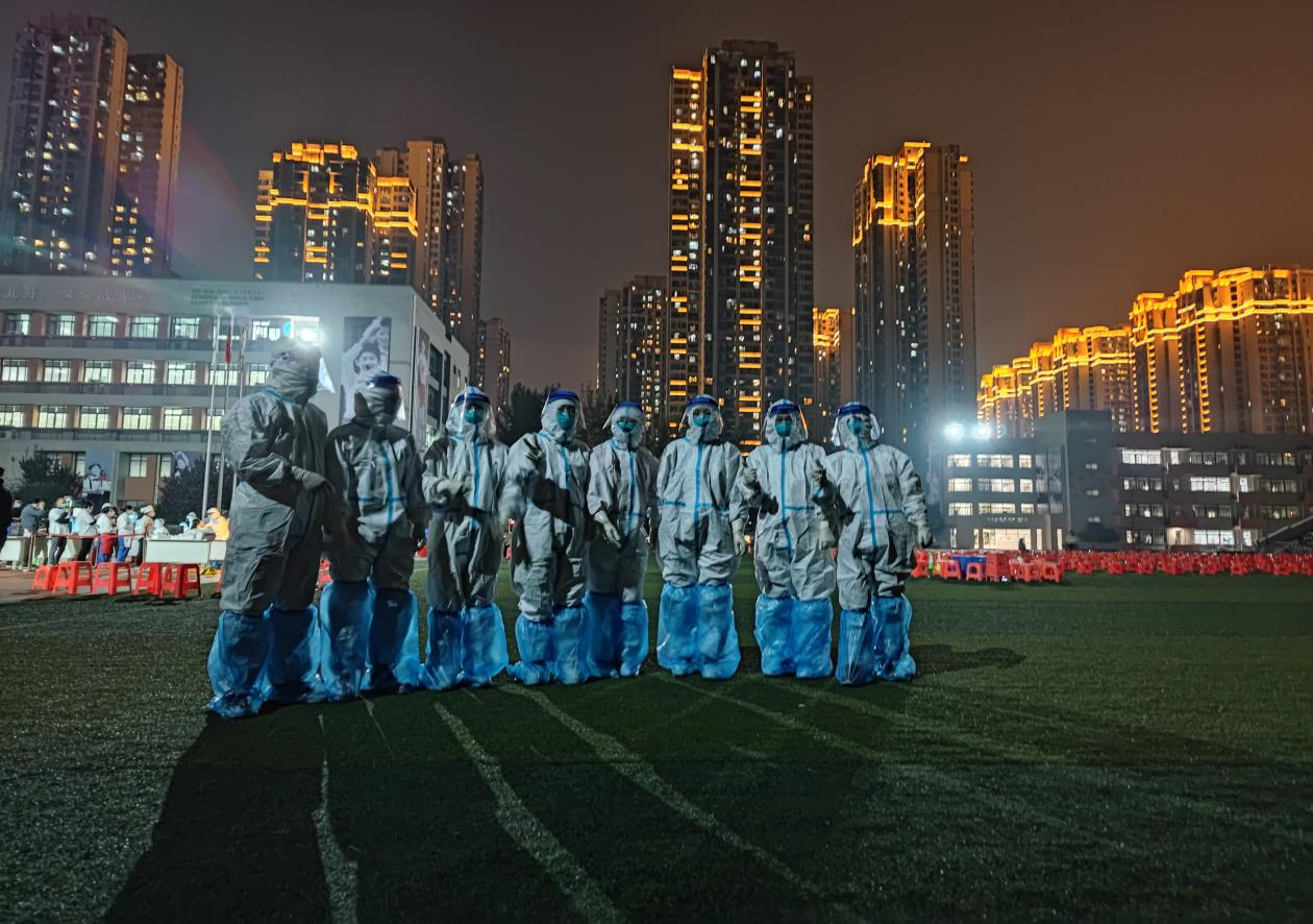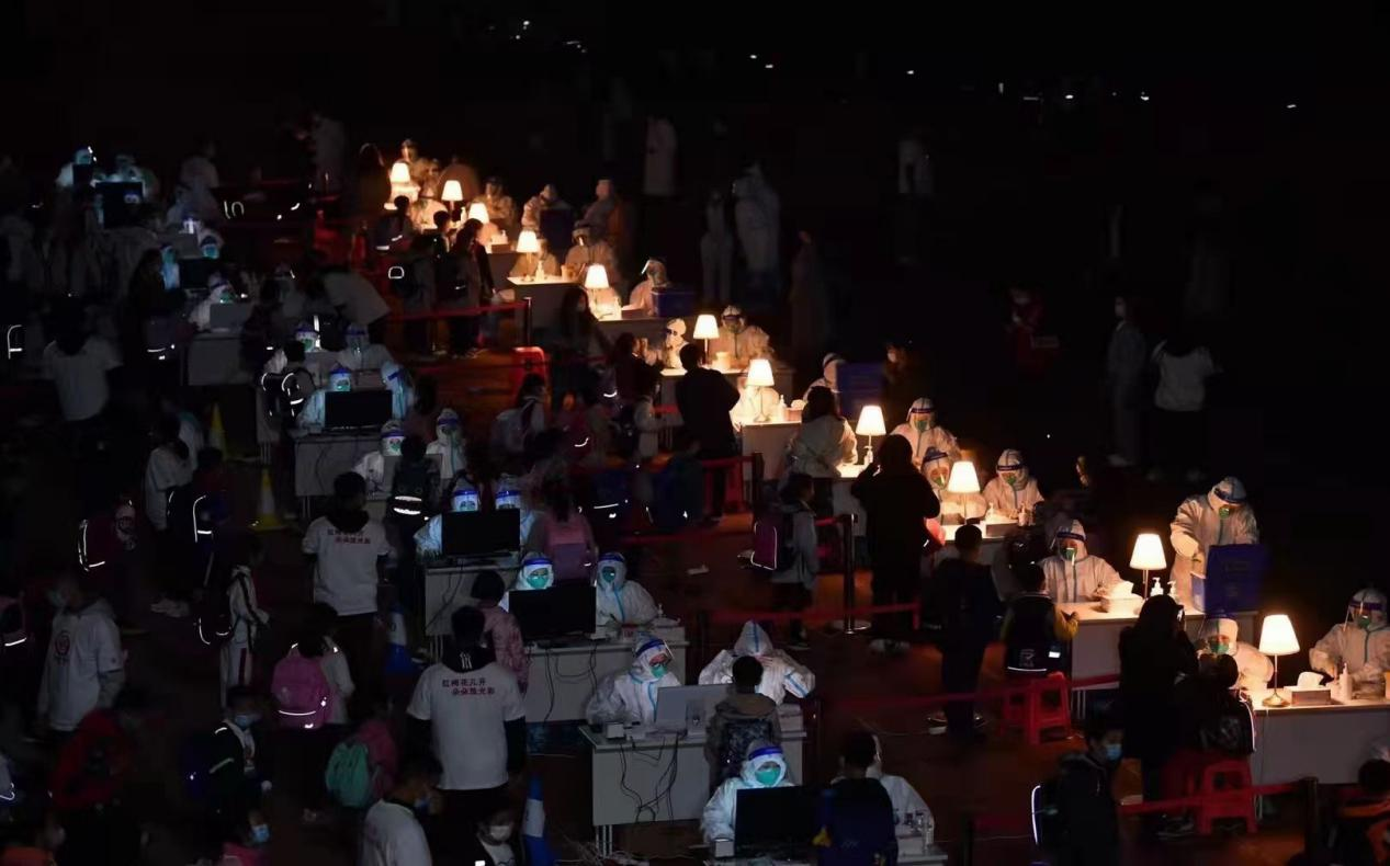 此时正值深秋时节,天气逐渐寒冷,但随着时间一点点过去,密不透风的防护服内,却满是汗水。晚上九点多钟,经过大家数小时的奋战,顺利完成了谢家湾小学近5000名师生核酸采集工作。