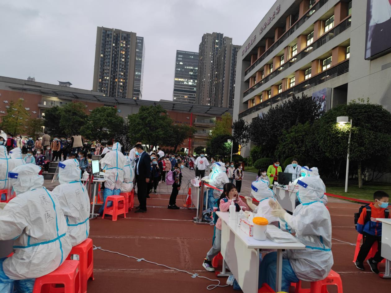 开始正式采集核酸了,在学校老师、谢家湾街道、志愿者等的大力支持下,小朋友们有序的进行核酸检测。