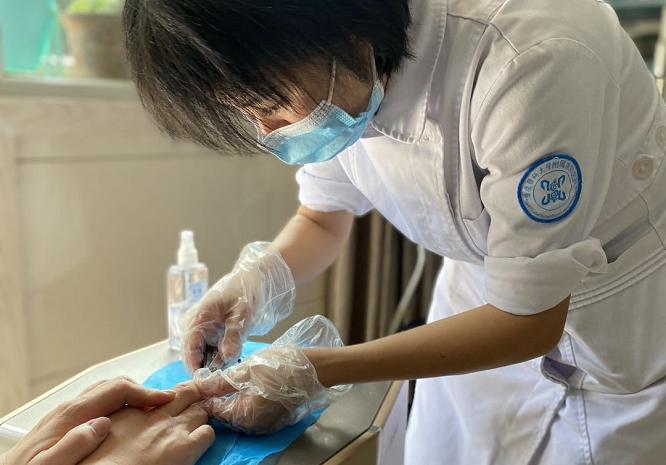 骨关节康复科护理团队大部分为年轻宝妈,大家都毫无怨言,默默在各自岗位坚守着。她们不仅要做好患者的医疗护理服务,还要兼顾生活护理服务。科室有位很爱干净的老人,因为疫情,家属不能探视,这段时间对自己指甲太长一事耿耿于怀,郁闷烦躁,陪护眼睛老花了也帮不上忙。科室护士徐梁分知道后,当机立断带上工具去给老人剪指甲,并细心地进行消毒处理,剪的过程中还不时指导老人几句如何保持手部卫生。徐梁分说:“身执白甲,就必须做自己该做的事儿,为患者的健康负责。”